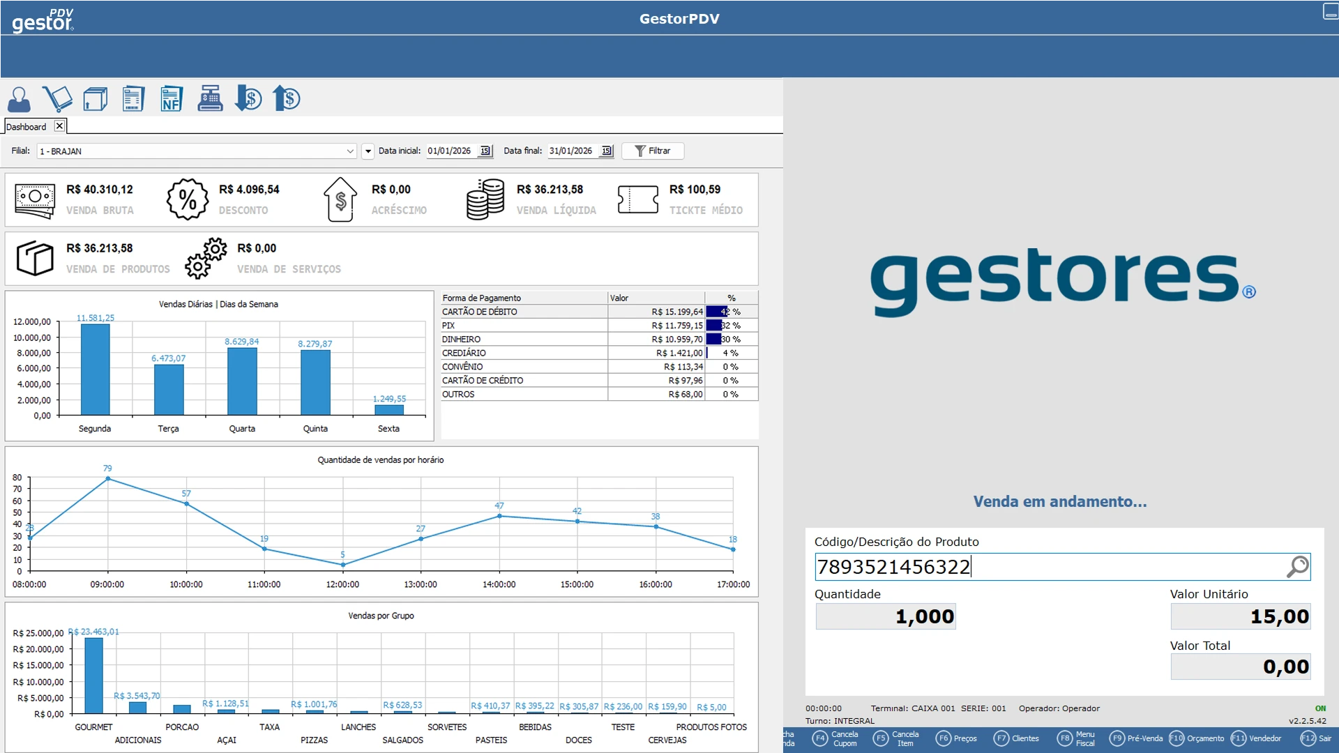 Frente de caixa rápido, gestão de estoque por giro de produto, promoções e combos, crediário, multiloja e análise de vendas para compras mais seguras.